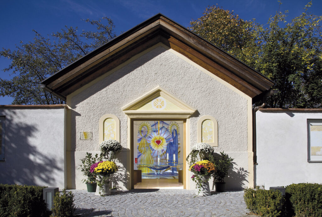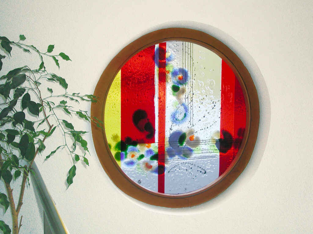 Stiegenhaus Rund-Fenster – Isolierverglasung aus zwei Schmelzglasscheiben. Äußere Scheibe mit aufgeschmolzenen Farbglas Streifen kombiniert mit Pulvertechnik. Innere Scheibe Reliefverschmelzung.
