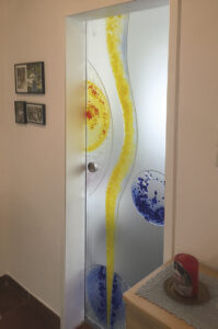 Ganzglas Element als Schiebetür oder Raumtrennung, satiniert 10 mm ESG Glas. Farbige Fusing Elemente Klarglas verklebt.